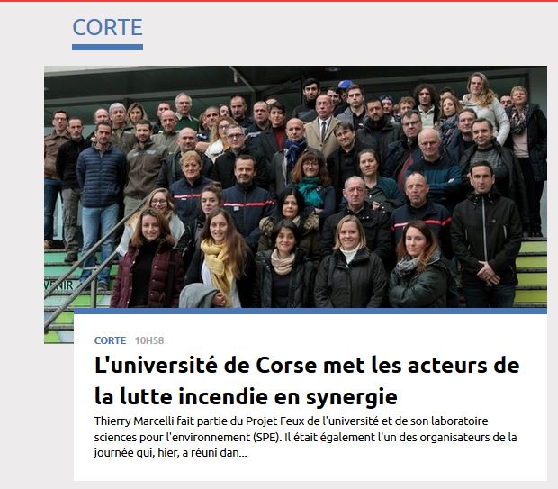 Le journal Corse Matin, dans son édition du 13 Décembre 2017, a réalisé un article sur la journée scientifique et technique organisée le 13 Décembre 2017 par le projet "Feux", la Direction de la Recherche et Transfert avec sa cellule de valorisation, l'Ecole Doctorale Environnement et Sociétés en collaboration avec la Direction Régionale de l’Alimentation, de l’Agriculture et de la Forêt de Corse.